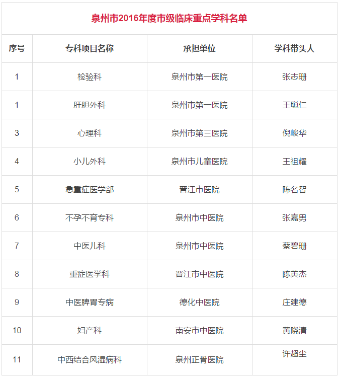 近日,泉州市卫计委公布了“2016年度市级临床重点学科名单”,6个市直、5个县级市级临床(中医)专科被列入重点专科建设项目,名单如下: